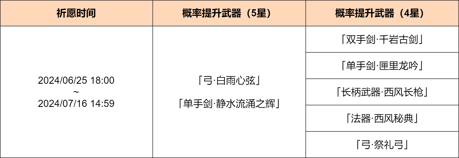 ●活動期間,限定5星武器「弓·白雨心絃」「單手劍·靜水流涌之輝」的祈願獲取概率將大幅提升!
